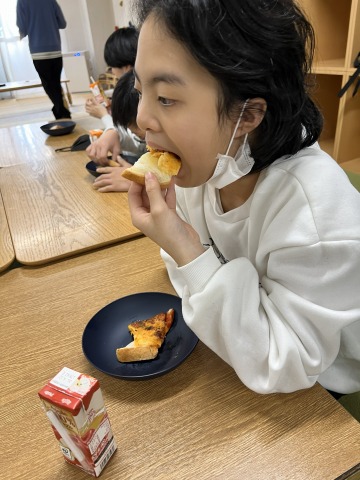 出来上がった食パンピザはみんなに好評でたくさんおかわりもしていました😊