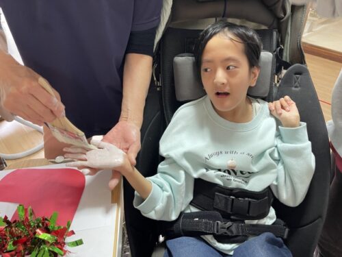靴下の形をした画用紙にキラキラのテープを貼ってかわいく💓