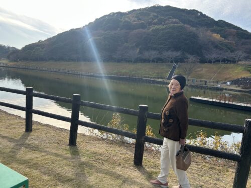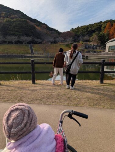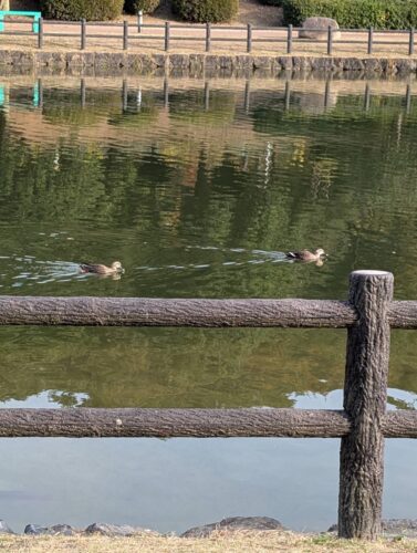 見ながら歩きました。池には沢山の鯉やカルガモが泳いでおり、「優雅に泳ぎよるね。」と、、、
