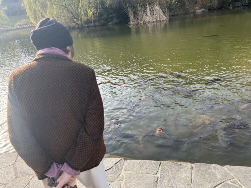 池の近くに鯉を見に行くと、、、沢山の鯉が集まっていました。「えさをまっているんだろうね。今もってないもんね。ごめんね」と
