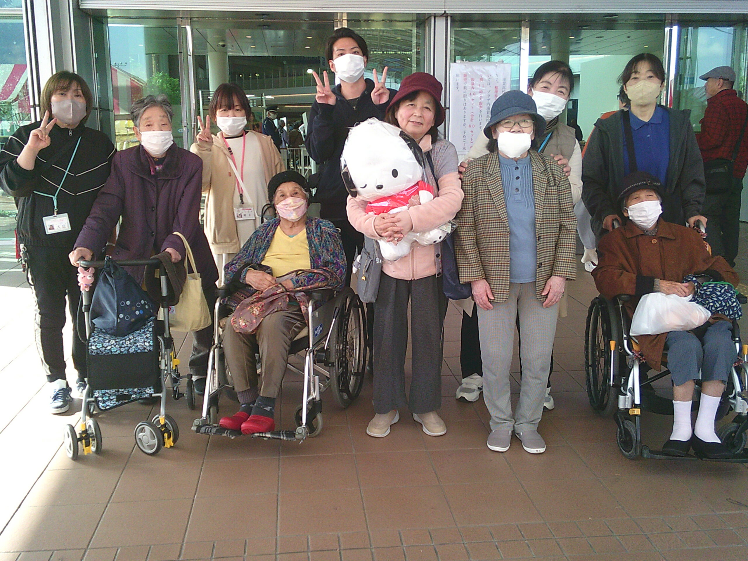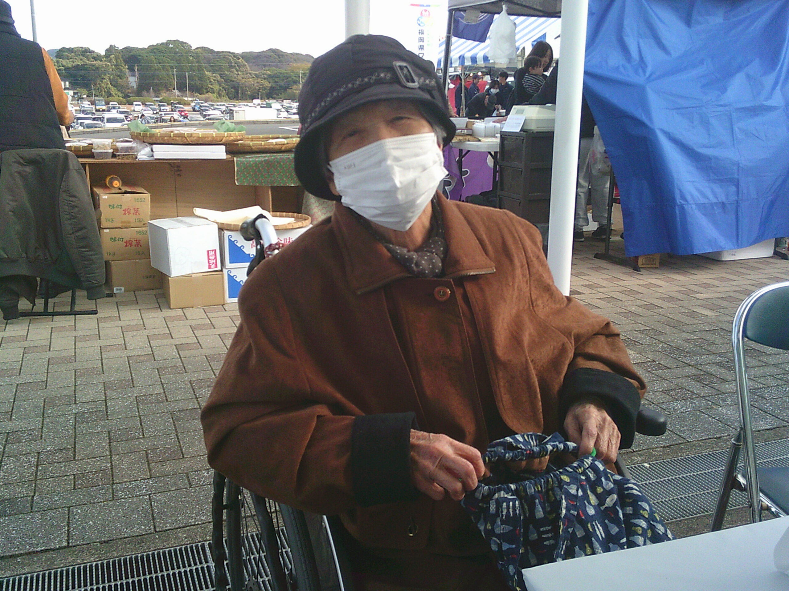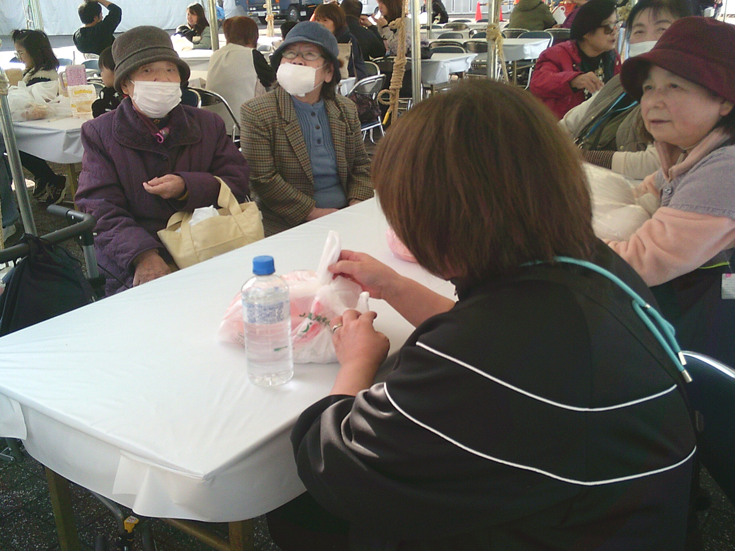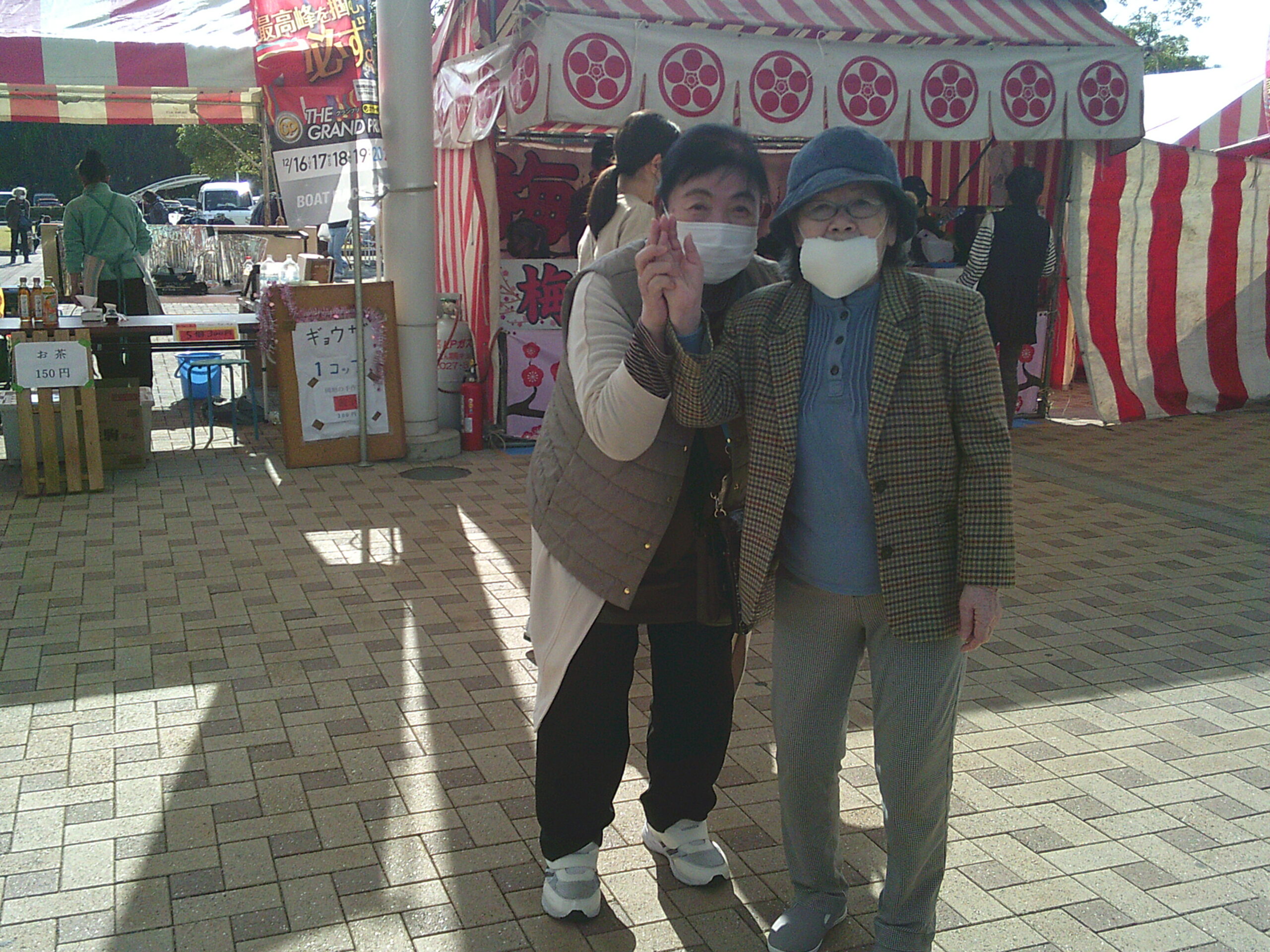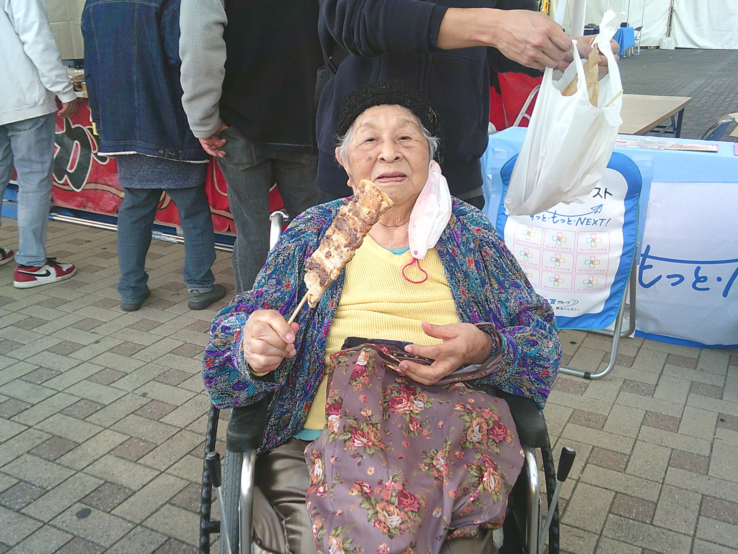 快晴で参加客がたくさんいる中で入居者様方と一緒に出店を見てまわり