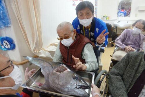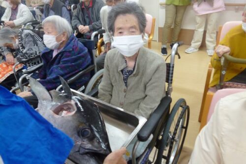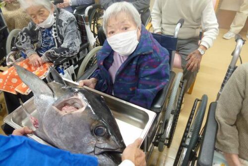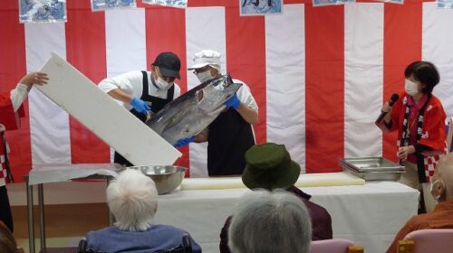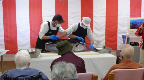 厨房さんのご協力の元、入居者様、家族様の目の前で解体ショーがスタートです♫