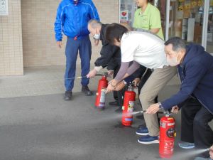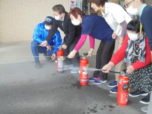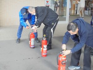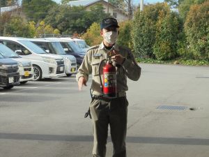 ご利用者様が消火器のレクチャー通りに噴射練習いたしました。