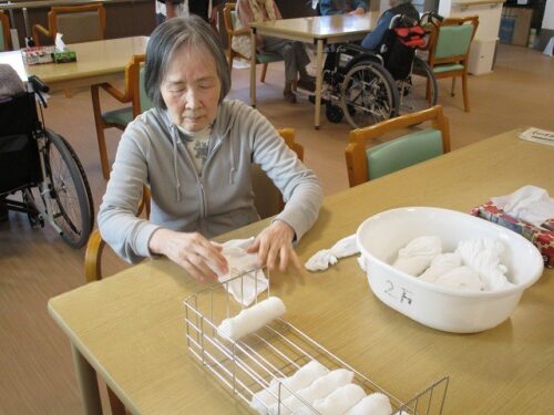 毎日、ご入居者様がおしぼり巻きを手伝って下さり