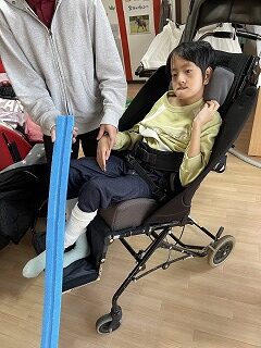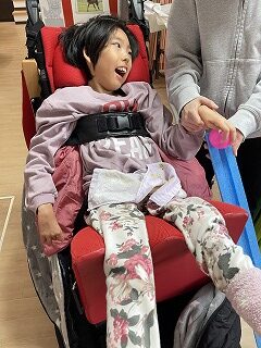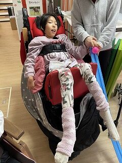 次のお友だちは職員と一緒にバギーからプールスティックのトイに