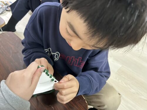 クリスマスツリーを選んだ児童は緑色の糸を、サンタ帽子を選んだ児童は、赤と白の糸を空いた穴に通していきます。