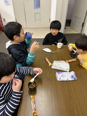 さらに、寒い日に嬉しいミニラーメンも一緒に食べました。「あったまる〜!」と、心もお腹も満たされる賑やかなおやつタイムになりました。