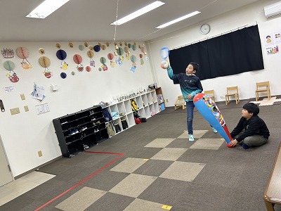 室内での運動遊びの様子「食後の自由時間には、室内で元気に体を動かして遊びました!」