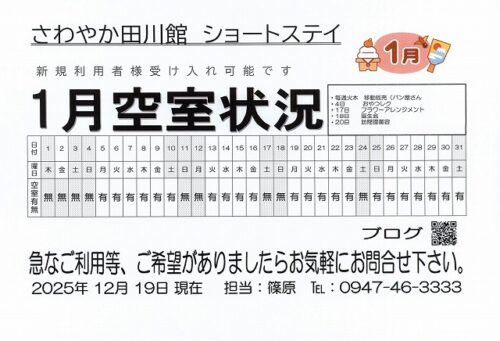 ショートステイの空室状況 12月/1月 [さわやか田川館]