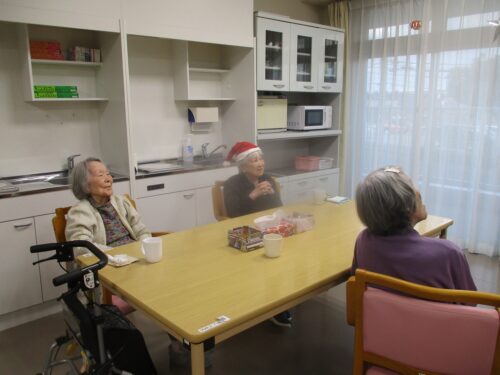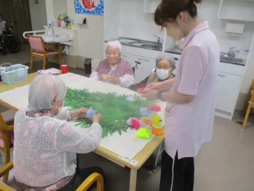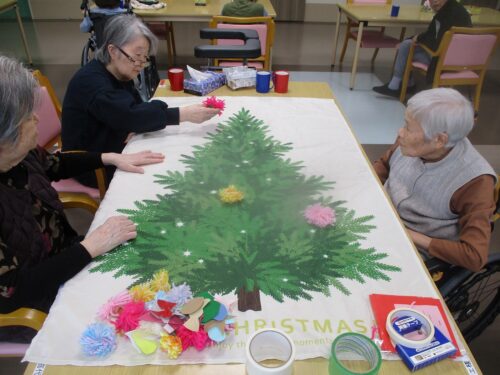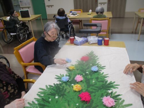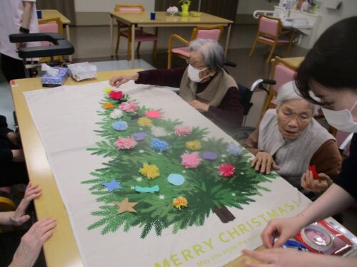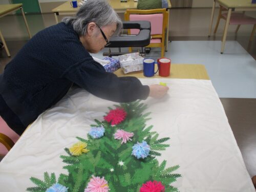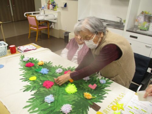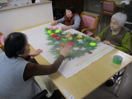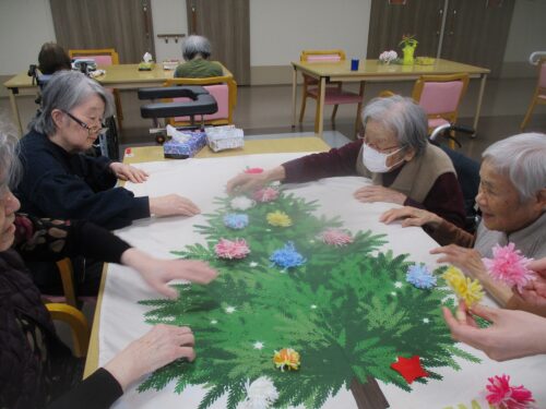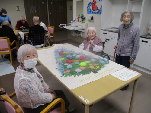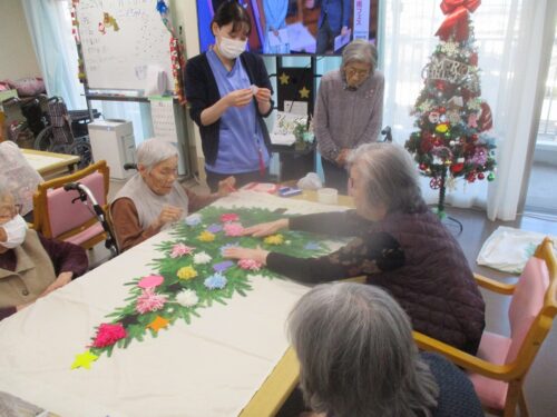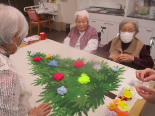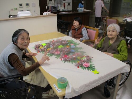 今回はクリスマスまであまり時間がなく準備に困っていたところに、4階のご入居者様から『手伝ってあげるから持っておいで』とお話しくださいまして、クリスマス会の準備制作を皆様で行いました。