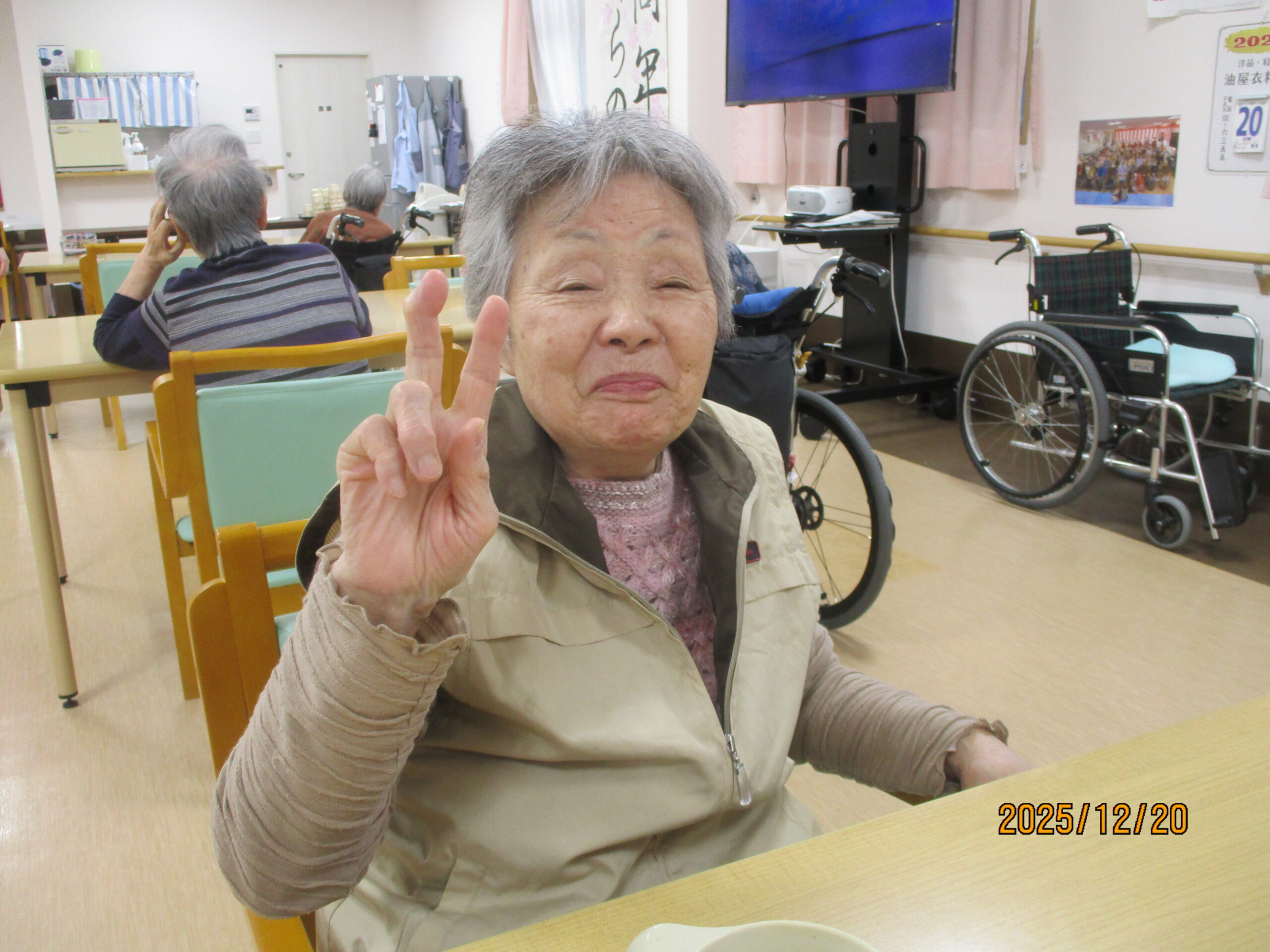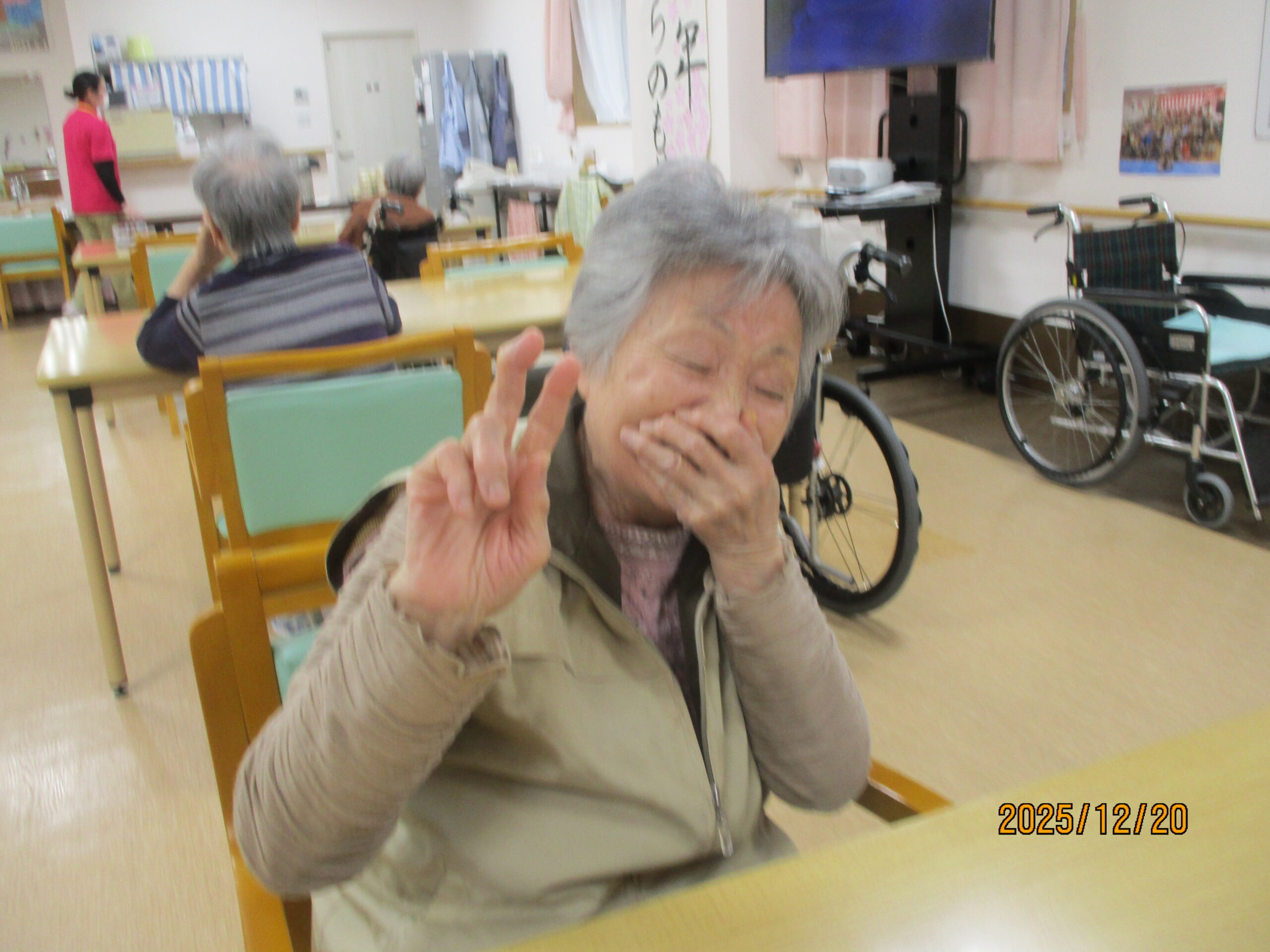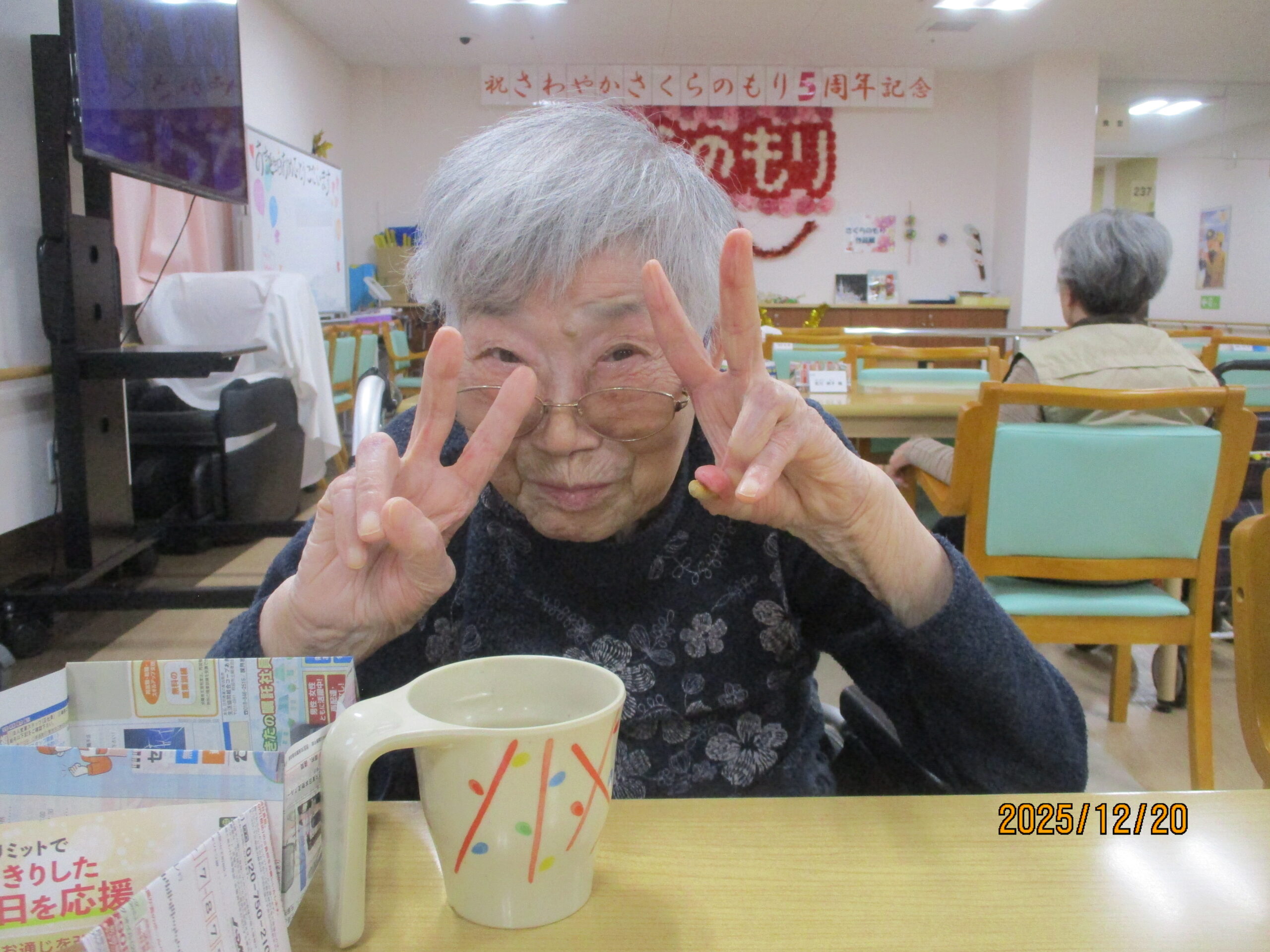 ご入居者様の笑顔で写真撮る時、思いっきり笑ってくれたり、ピースをして楽しまれている様子ありました。ちなみにお茶を飲んでいる様子撮りたかったですけれど残念ながら全部飲んでしまいました。次は飲んでいる姿をお見せできるよう頑張りたいと思います。本日のブログは午後の様子でした。明日のブログもお楽しみに。