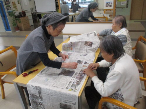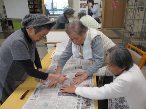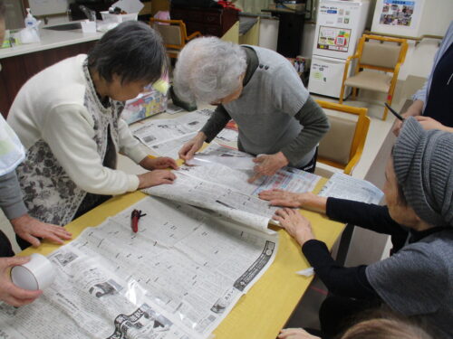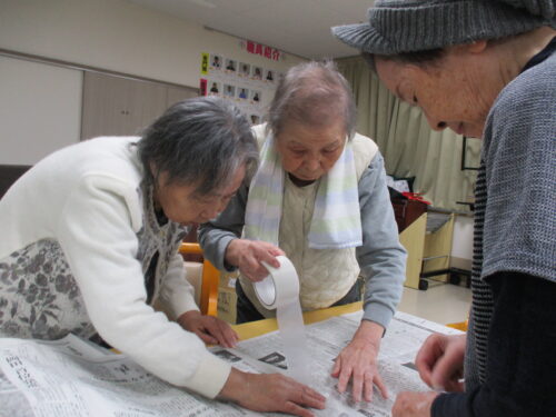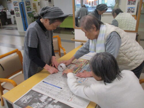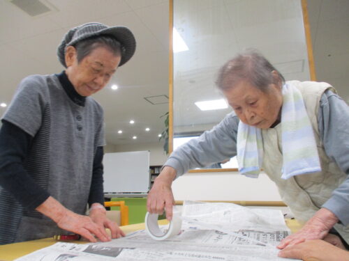 新聞を抑える係・テープを貼る係・テープをカットする係に分かれて