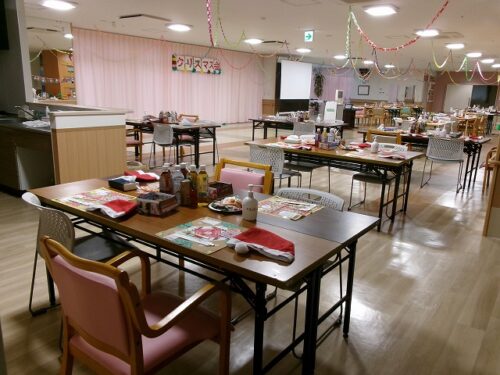 さわやか室蘭弐番館 20日 クリスマス会♪ 2025-12-22 2025-12-22 皆様こんにちは♪ 複数回になりますが クリスマス会の様子をお届け致します 1階ホールが会場です 入居者様がお花紙で 制作されたボードを設置しました クリスマス柄のペーパーナプキンで テーブルコーディネートしました🎄