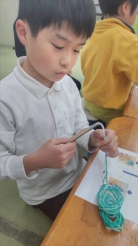 ツリー🎄の形の型紙にのりを塗って毛糸を巻いていきます🧶