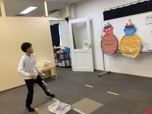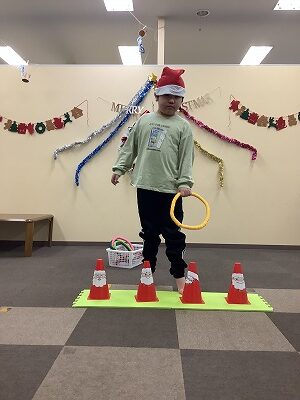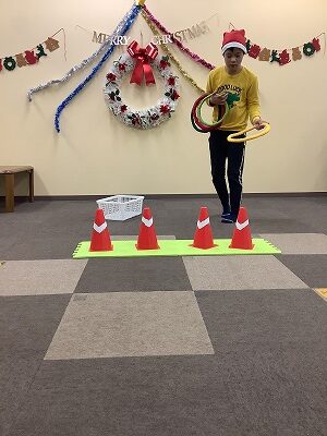 続いては、オリジナルの「サンタクロース輪投げ」に挑戦! サンタさんの顔がついたコーンをめがけて、輪っかを「えいっ!」。 「惜しい!」「入ったー!」と応援の声が飛び交い、大盛り上がりのゲームタイムとなりました。集中して的を狙う表情は、本物のサンタさんにも負けないくらい真剣でしたよ。