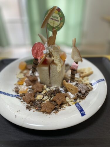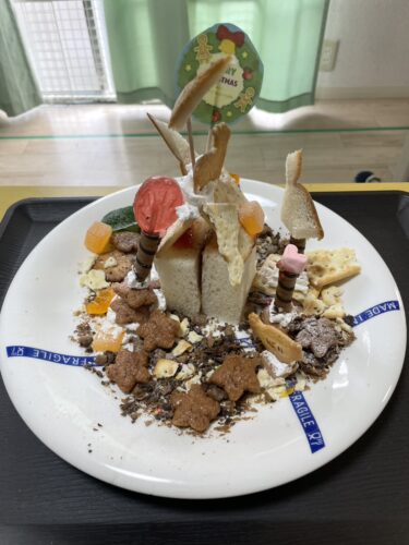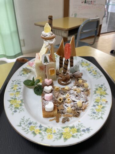 こんにちは。12月23日はクリスマスにちなんでお菓子の家を作りました!