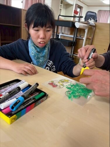 「ここは何色にする?」と児童と一緒に考えながら黒の枠の中を色塗りしました。