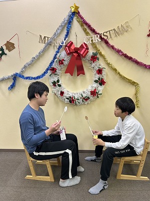 「最初はグー!ジャンケンポン!」 あちこちから元気な声が響きます。サンタさんになりきった子どもたちは、いつも以上に気合十分!お友達と向き合って、真剣ながらも笑顔が絶えない楽しい対戦となりました。