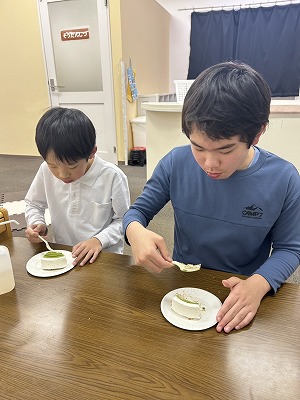 ゲームでたくさん笑って体を動かした後は、お待ちかねのケーキタイムです。 真っ白なクリームに鮮やかな緑が映える、クリスマスらしいケーキを用意しました。