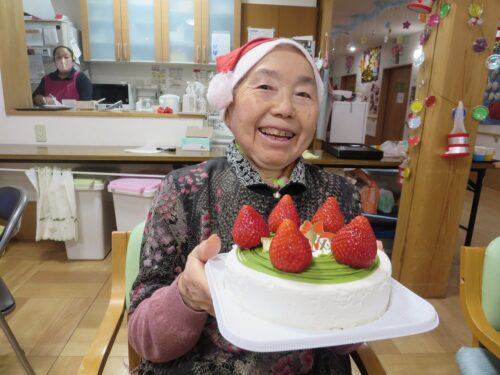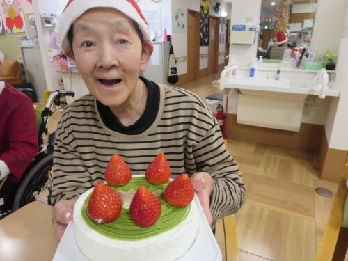 ケーキの上の大きな🍓イチゴ🍓はご利用者様のご家族様からの差し入れです。