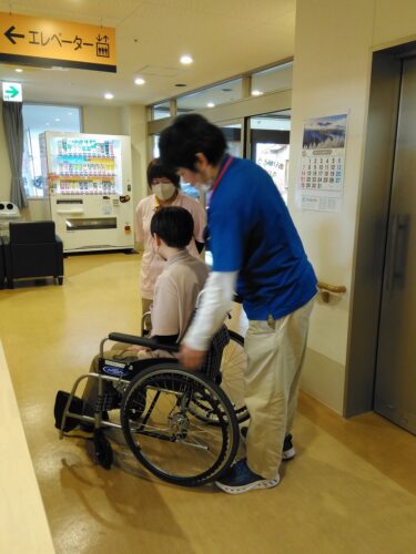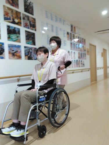 車椅子の研修ではスタッフ同士で介護者・介助者を交代しながら安心・安全な介護が出来るかを