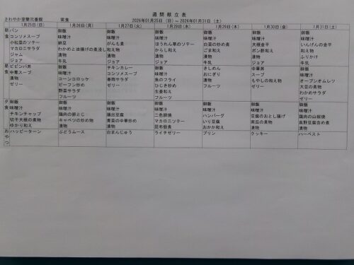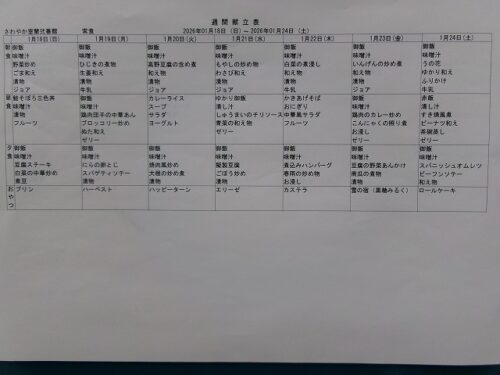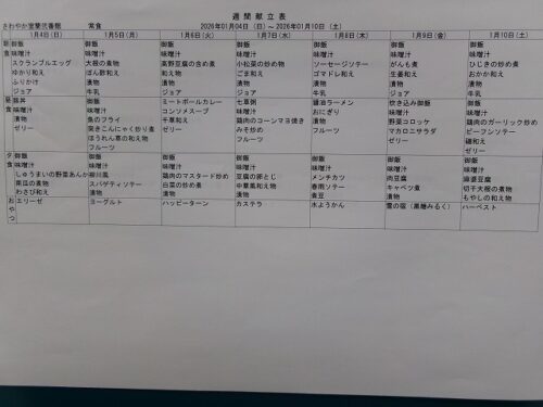 さわやか室蘭弐番館 1月 献立♪ 2026-01-01 2025-12-29 皆様こんにちは♪ 1月の献立をお届けします 行事食は1日(木) 24日(土)の昼食です エレベーター内にも掲示しております 食材の都合で急遽 変更させて頂く場合もあります ご了承下さい