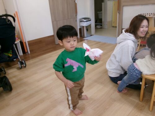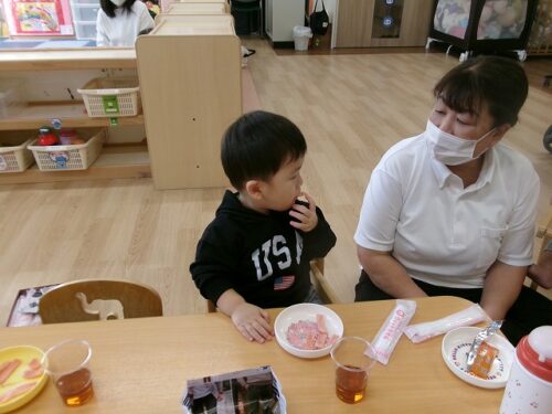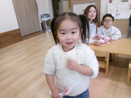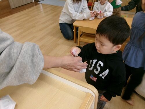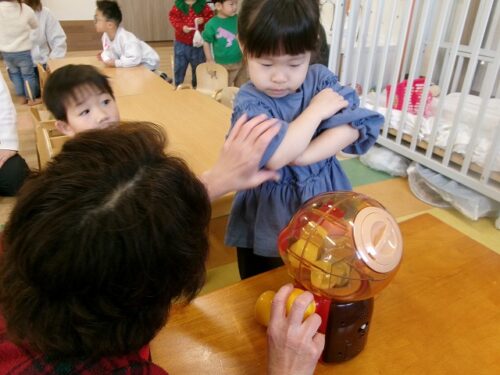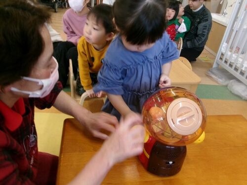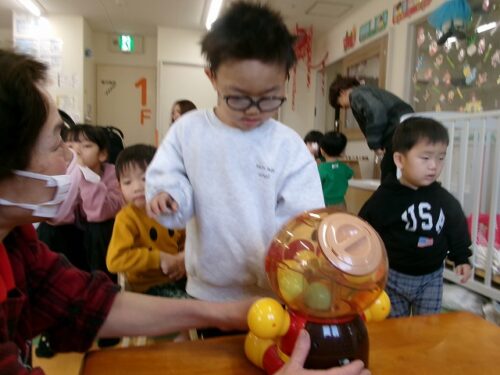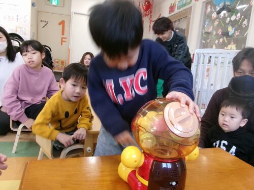 保育者がアンパンマンのガチャガチャを持ってきてくれました~