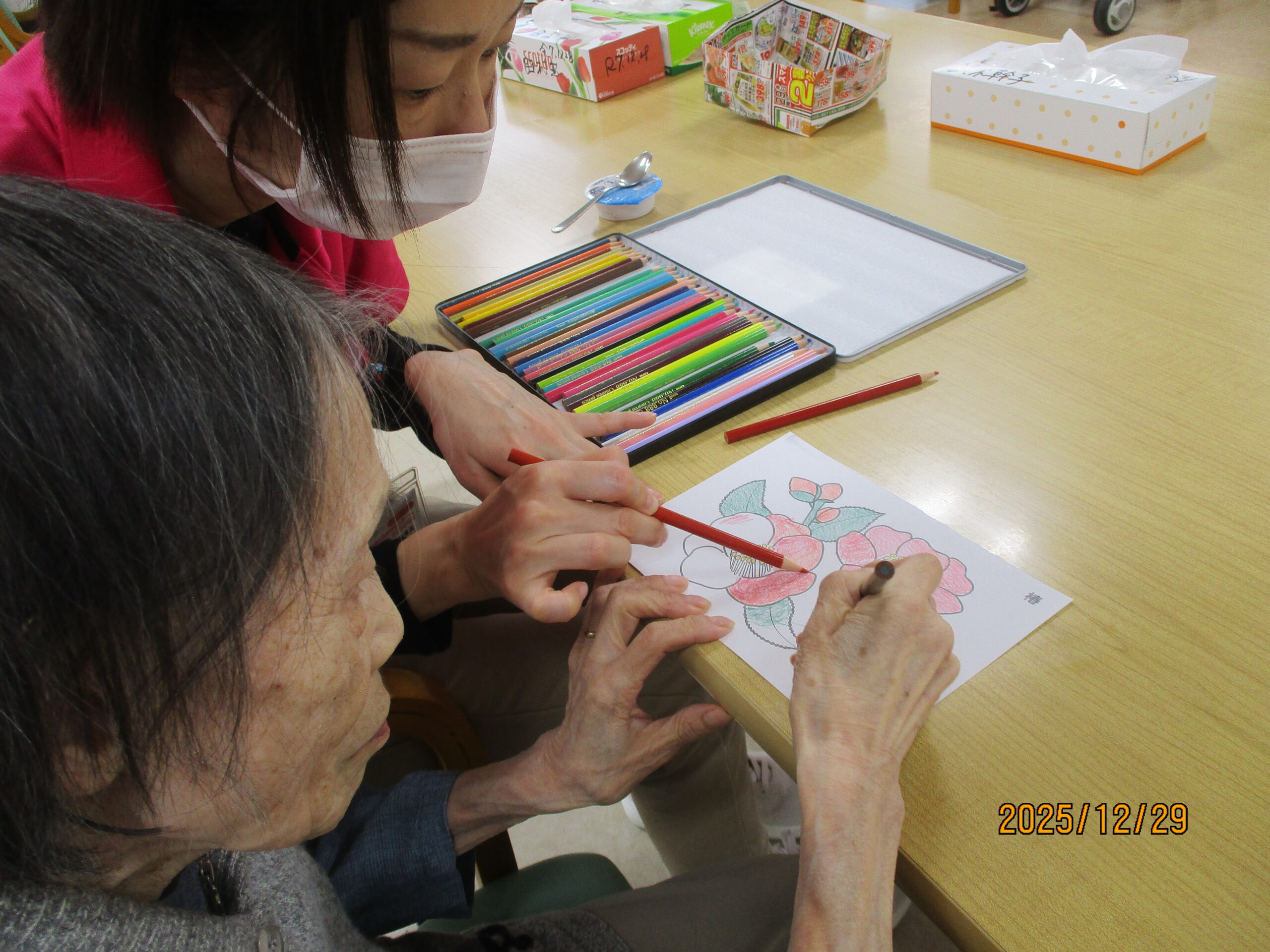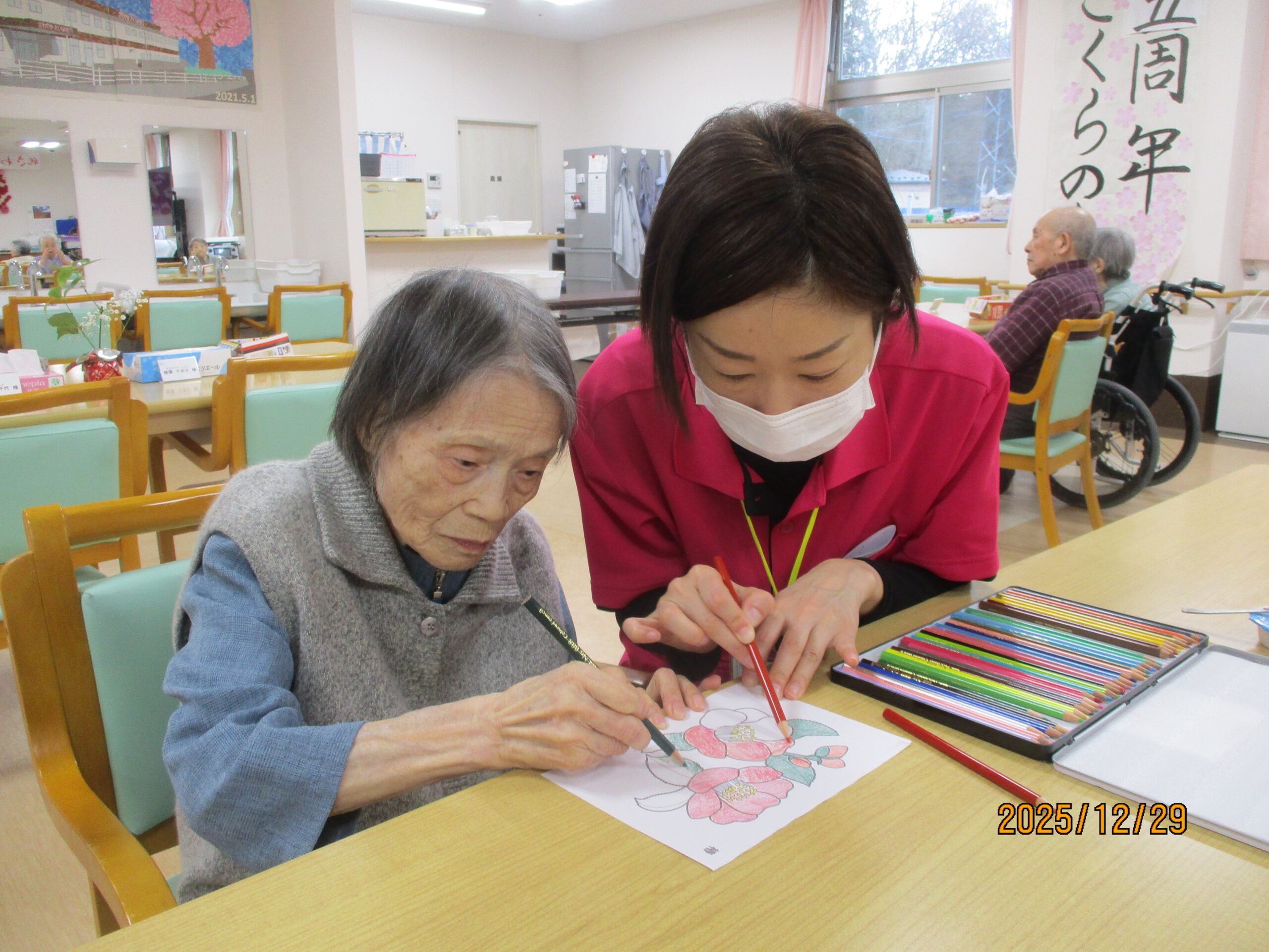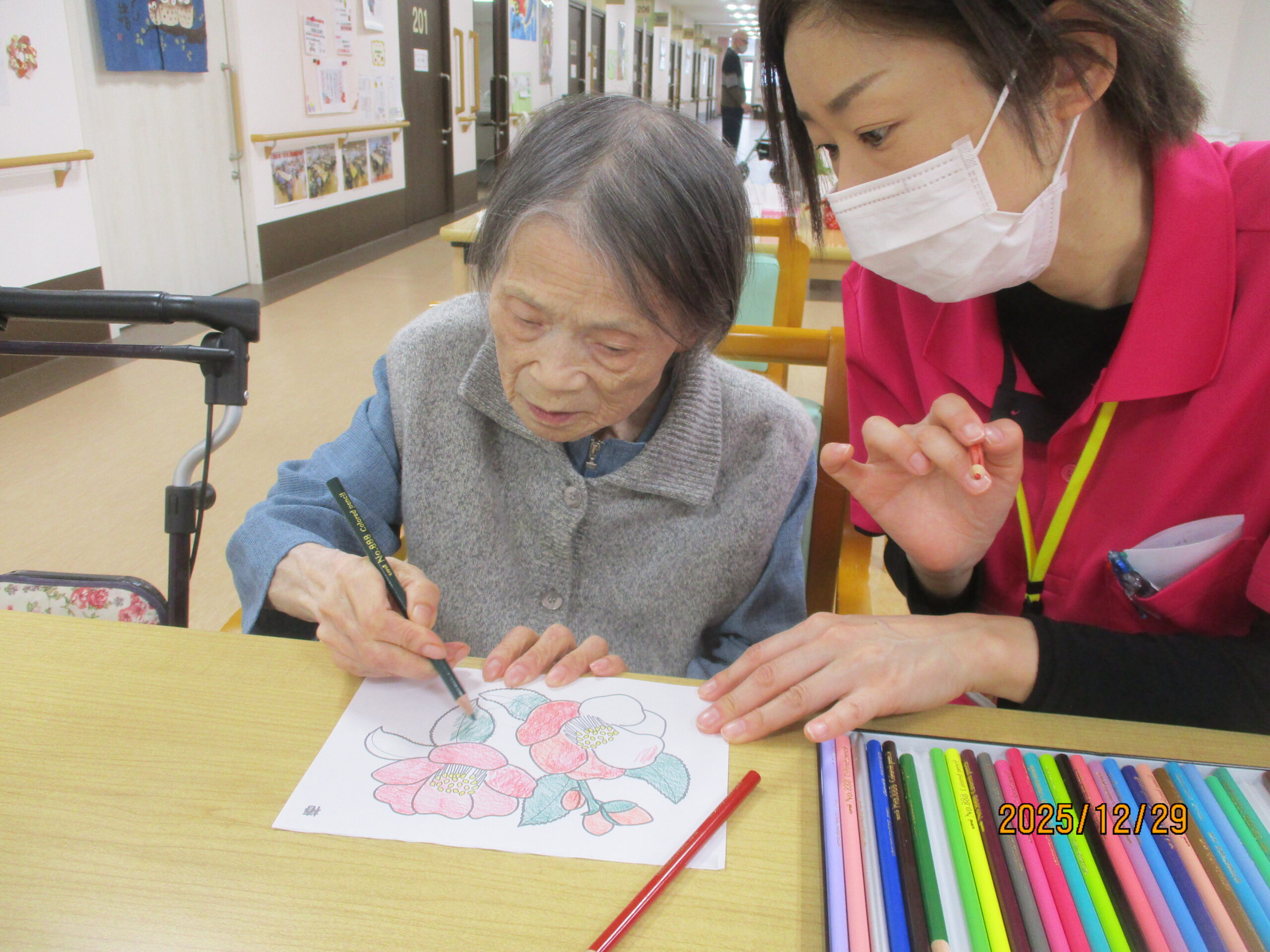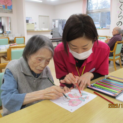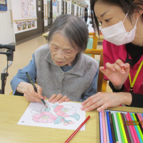 ホールで塗り絵をしていると