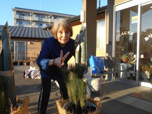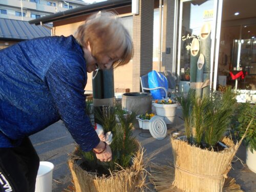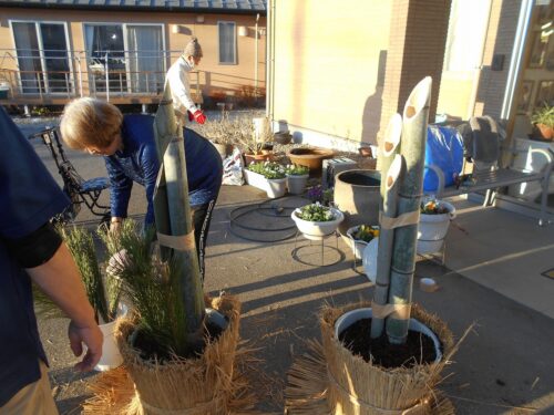 ピース✌️と共に土台ができたら竹を入れて、間に砂を入れ固定します