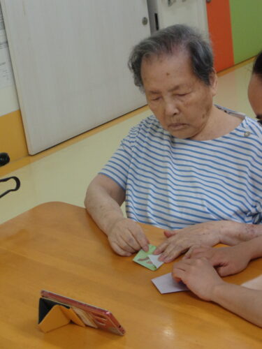 さわやか中原館 午後のひととき、折り紙やってます!! 2024-08-10 2024-08-10 午後のひとときでした。 職員さんの声掛けで、折り紙しました。風鈴の傘の部分を作り上手くできた感じでした。 指先の運動も兼ねて、小さいゴミ箱も作りました。 ブログ担当、ひらやま