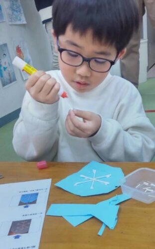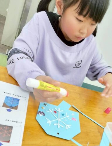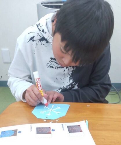 最初に画用紙を切って、綿棒を雪の結晶の形に貼っていきます。