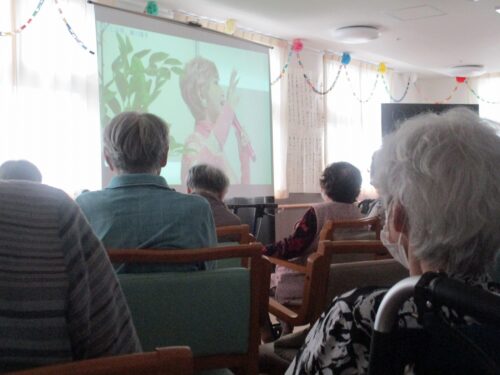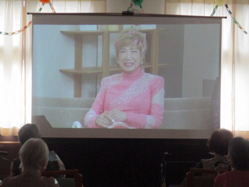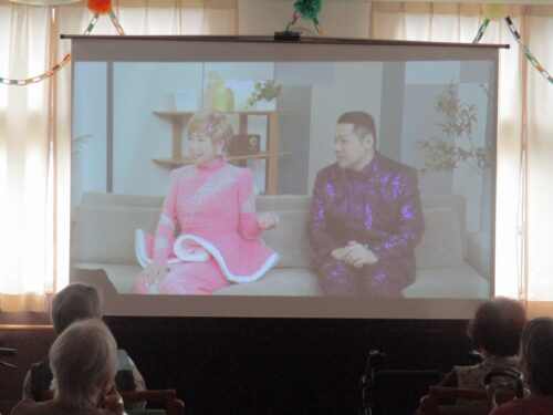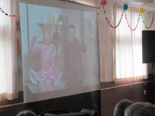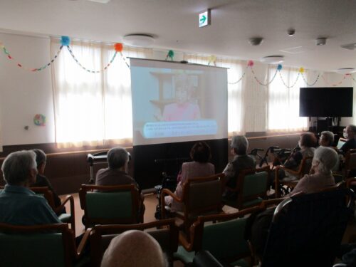 皆様スクリーンを見て、お隣同士のご入居者様と話したり、