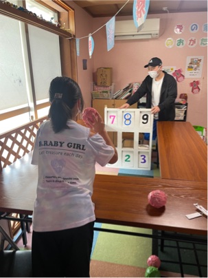 職員手作りの的に向かって
