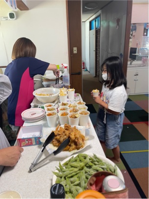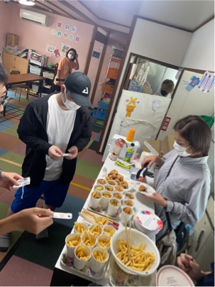 唐揚げ、ポテト、おにぎり、枝豆、焼きそば、などなど〜