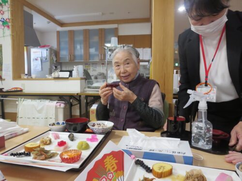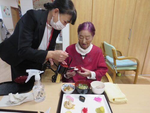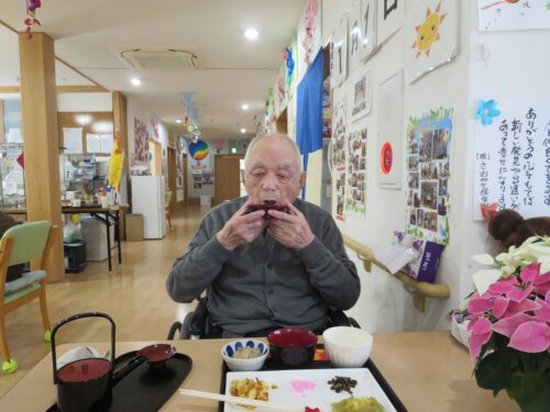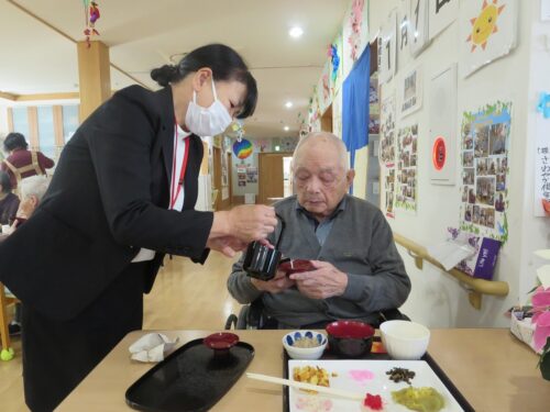 さわやかグループホーム なすしおばら すいせんユニットの様子 『お正月の風景その②』 2026-01-03 2026-01-02 元旦にお屠蘇を召し上がって頂きました。 おせち料理と一緒にお正月のお祝いをして頂きました。