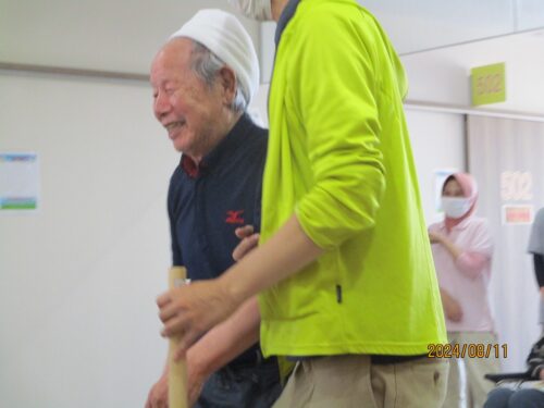 スイカ割りの感想をお伺いすると「案外スイカって硬くて割れないものですね」「スイカや棒がこんな重たいと思わなかった。」「まっすぐに振り下ろしたのに割れなくて残念」等色々な話を聞きました。