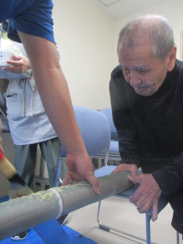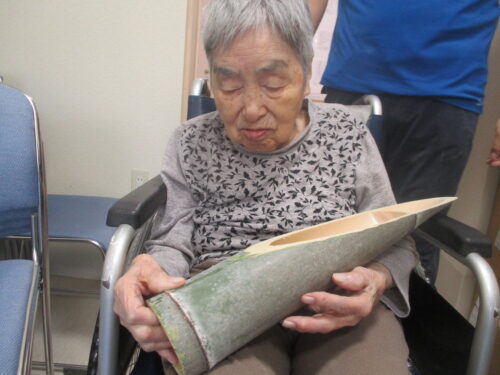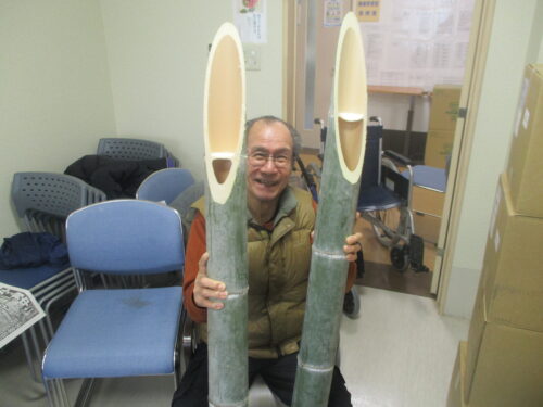 竹を切るのを押さえてもらい