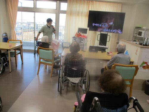 歌いたい曲は何ですかとお伺いすると、歌ってほしい曲があるといわれ、東京バスガールを歌うと歌につられて皆様も素敵な声で合唱がおきました。