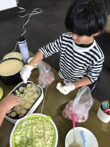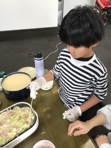ウィンナーとチーズとベーコンと鶏肉など何を入れるかを子どもたちは自分たちで決めて作りました。