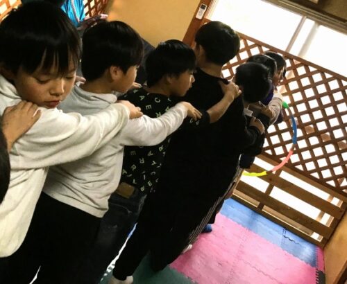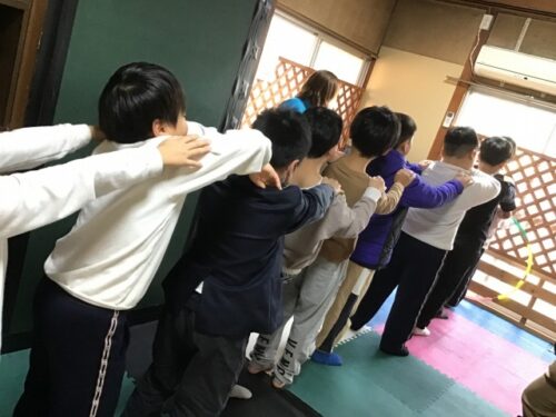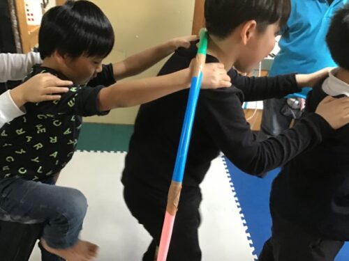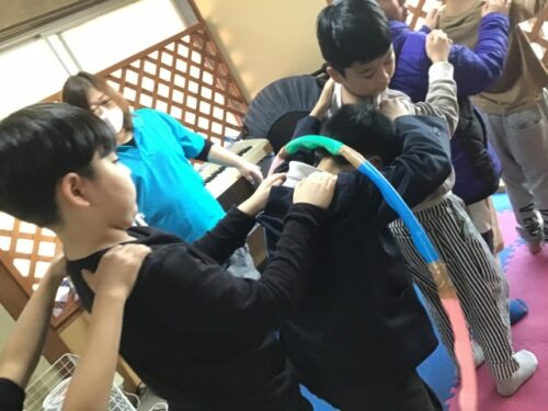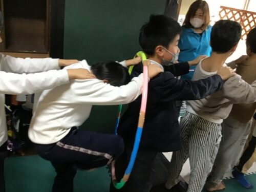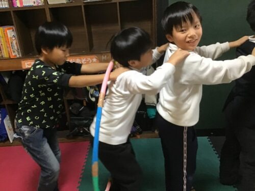 今回の活動では、《協力フープくぐり》を行いました。