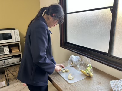 安全に配慮された子ども用包丁を使用し、職員が見守りや補助を行いながら、バナナを切る作業に挑戦しました🔪✨