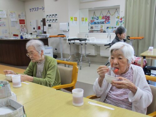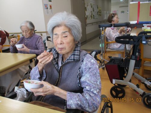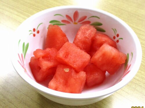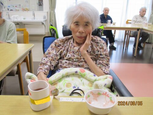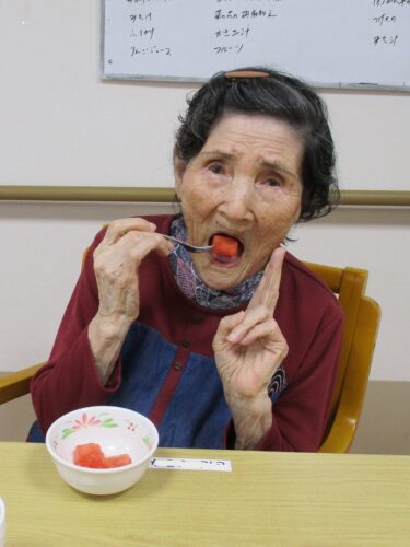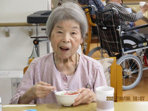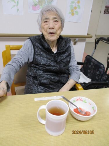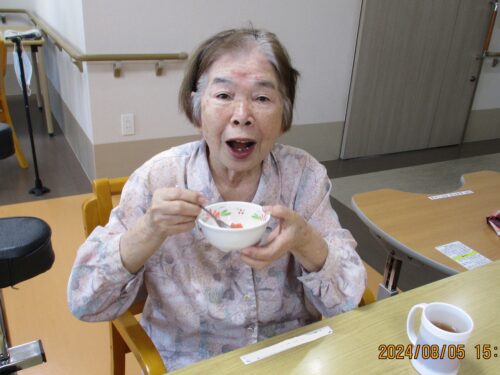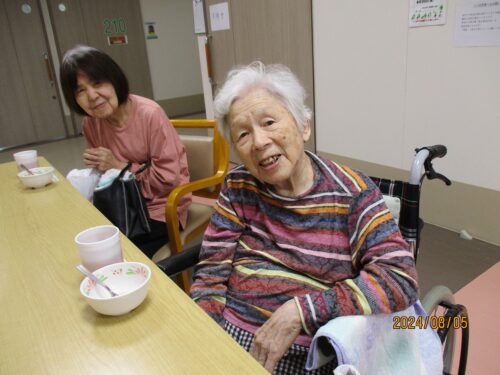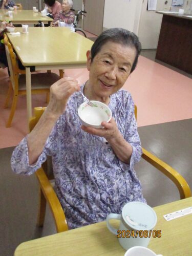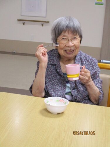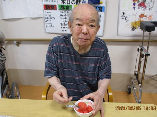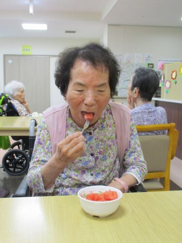 さわやかあかしの里 スイカ割り(part2) 2024-08-12 2024-08-12 スイカ割りの後、厨房さんが切って下さいました。 早速、いただきました。 「甘くて美味しい」と、 カメラをむける間もなく、 あっという間に完食されました。