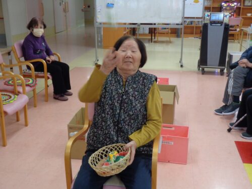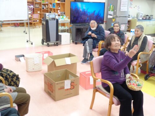 今日は後ろ向きにお手玉を投げて点数を競うというゲームをやってみました!