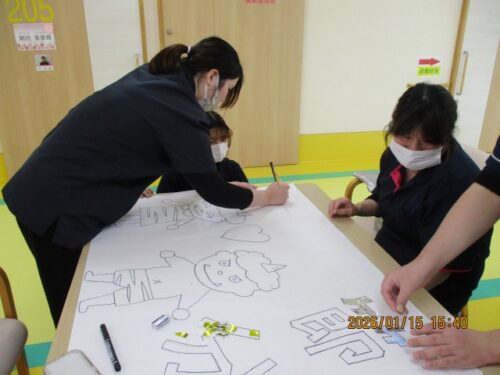 さわやかリバーサイド西脇 👹節分の壁紙作り👹 2026-01-16 2026-01-16 お正月明けの「とんど焼き」も終わり次は節分の準備です🎵 ちぎり絵のように貼り付けてゆきます もうすぐ完成間近🎵 少々お疲れでした💦 ご協力ありがとうございます❢ 完成作品はフロアーで掲示させていただきます🎵お楽しみに🎵