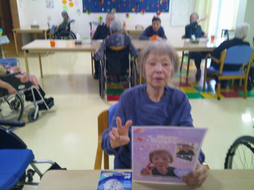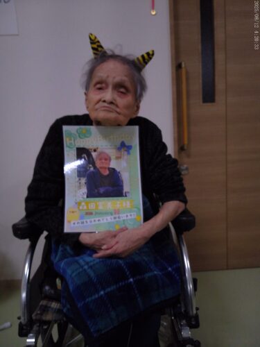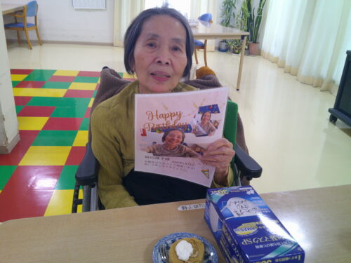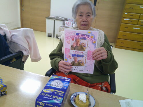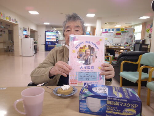 さわやかゆう輝の里 お誕生日おめでとうございます。1月生まれの入居者様は7名でした。 2026-01-18 2026-01-18 ピース(おめでとうございます) プレゼントにマスクを貰いました。 今日のおやつはロールケーキ お誕生日おめでとうございます!