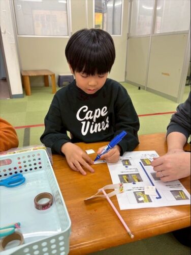 制作で、ストローと画用紙を使って紙コプターを作りました