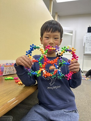 おやつの後の自由時間には、指先をしっかり使うフラワーブロックが大人気。 一つひとつのパーツを丁寧につなぎ合わせて、とってもカラフルで複雑な形の**「大作」**が完成しました!