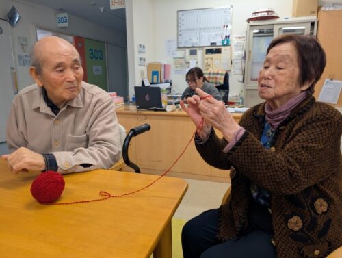 また、男性の入居者様も興味津々で編まれる様子を見学されておられました(^_-)-☆