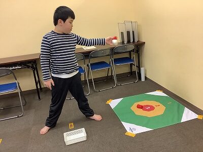 床に広げた的に向かって、お手玉のようなボールを優しく投げ入れます。 「力いっぱい投げればいい」というわけではなく、絶妙な力加減が必要なこのゲーム。