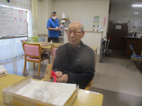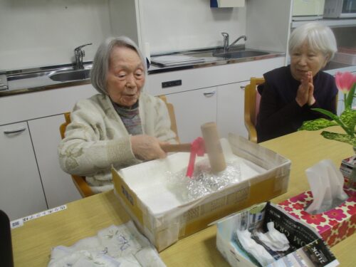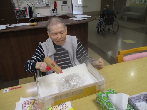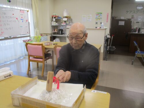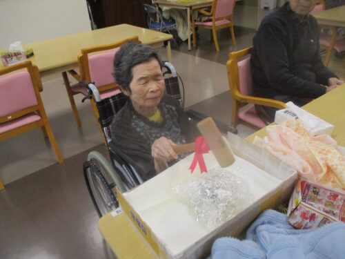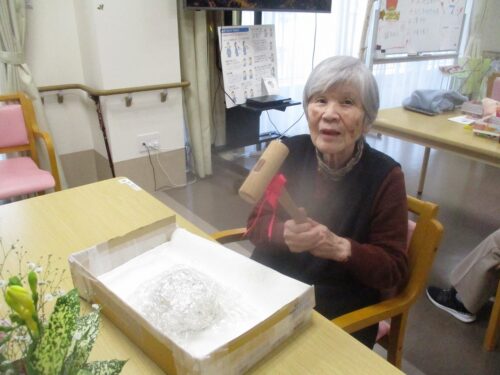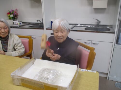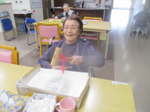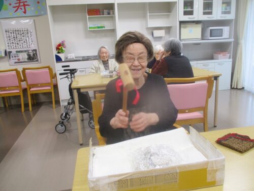 職員がやさしく鏡餅をたたいてくださいねとお声がけをさせていただくと、強くたたいておられる方が多く、とても楽しまれておりました。